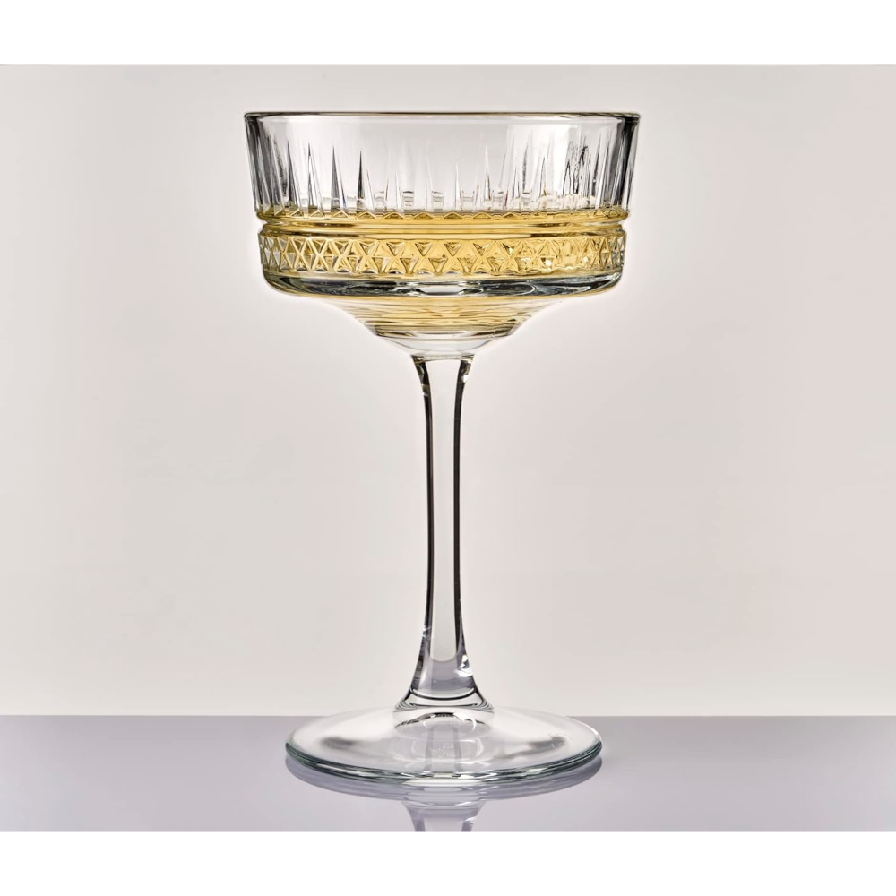 Elysia je eleganten, širok kozarec za penino in koktajle, izdelan iz kakovostnega kristalno jasnega stekla. Odlikujejo ga dekorativne rebraste linije, širša čaša, stabilen pecelj in prestižen videz. Primeren za posebne priložnosti ali profesionalno rabo.
